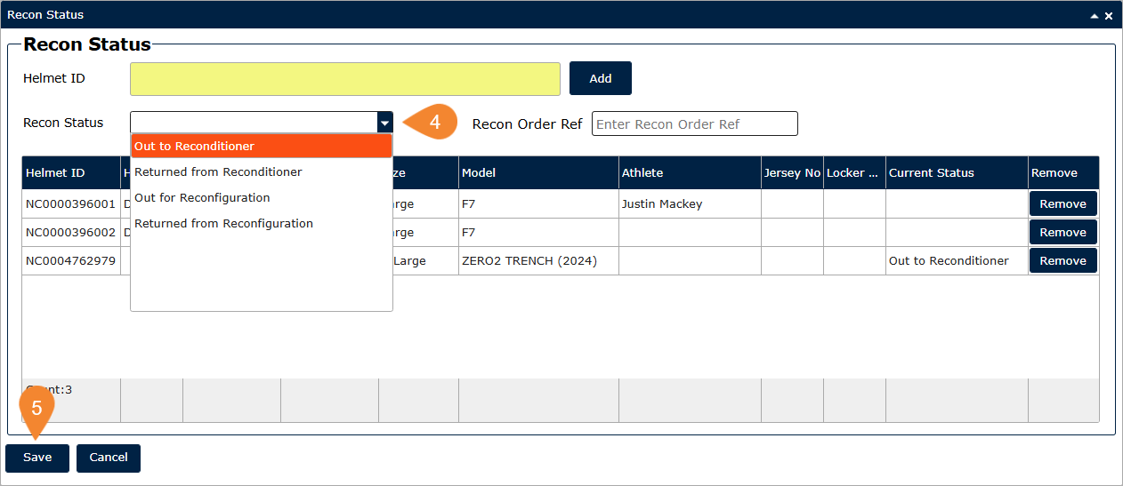 Recon Status - Update helmets "out to" and "returned from" reconditioner