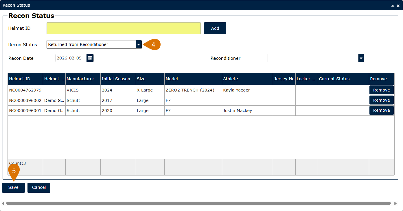Once your helmets have returned from the reconditioner, you can follow these steps to update your helmets in the system.