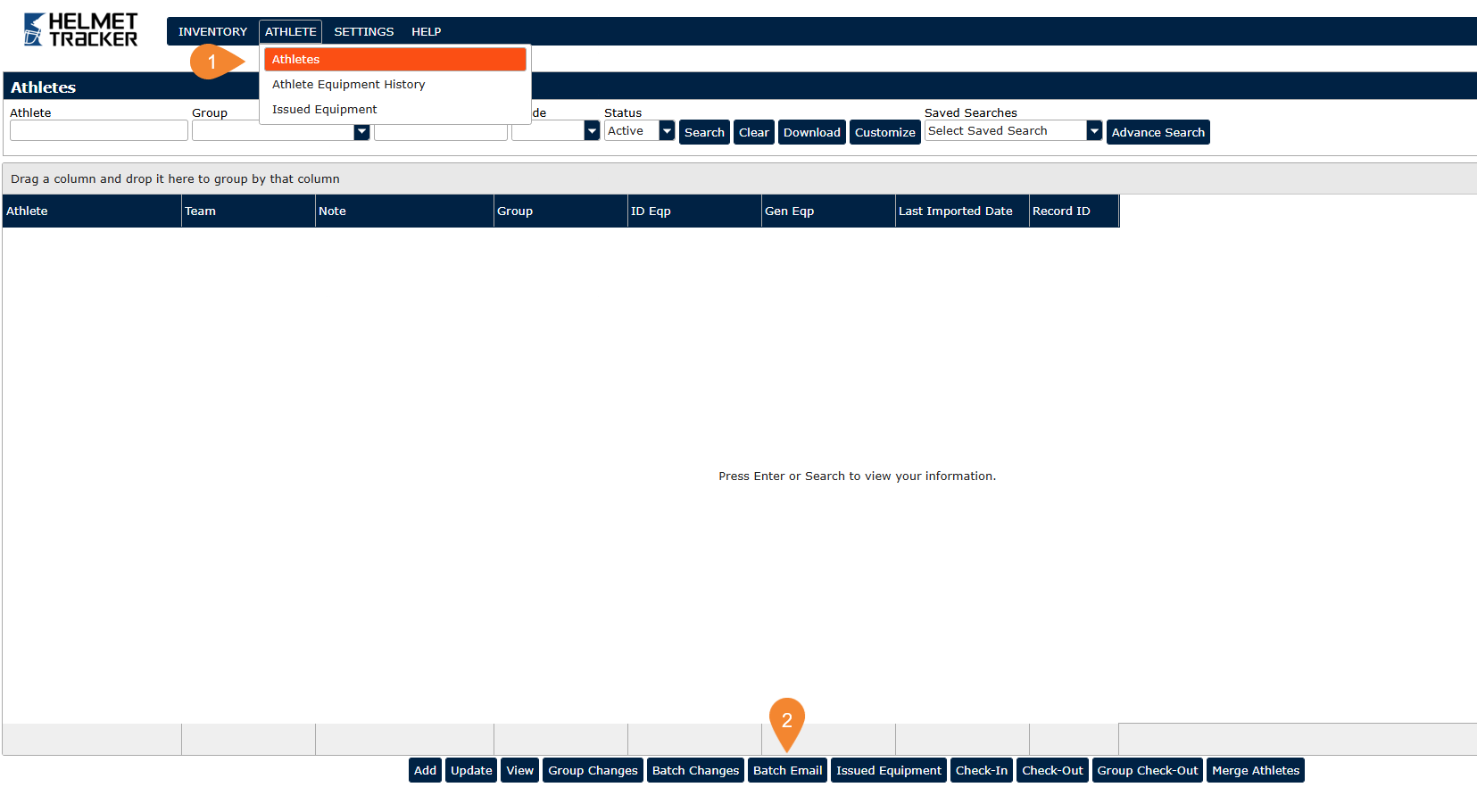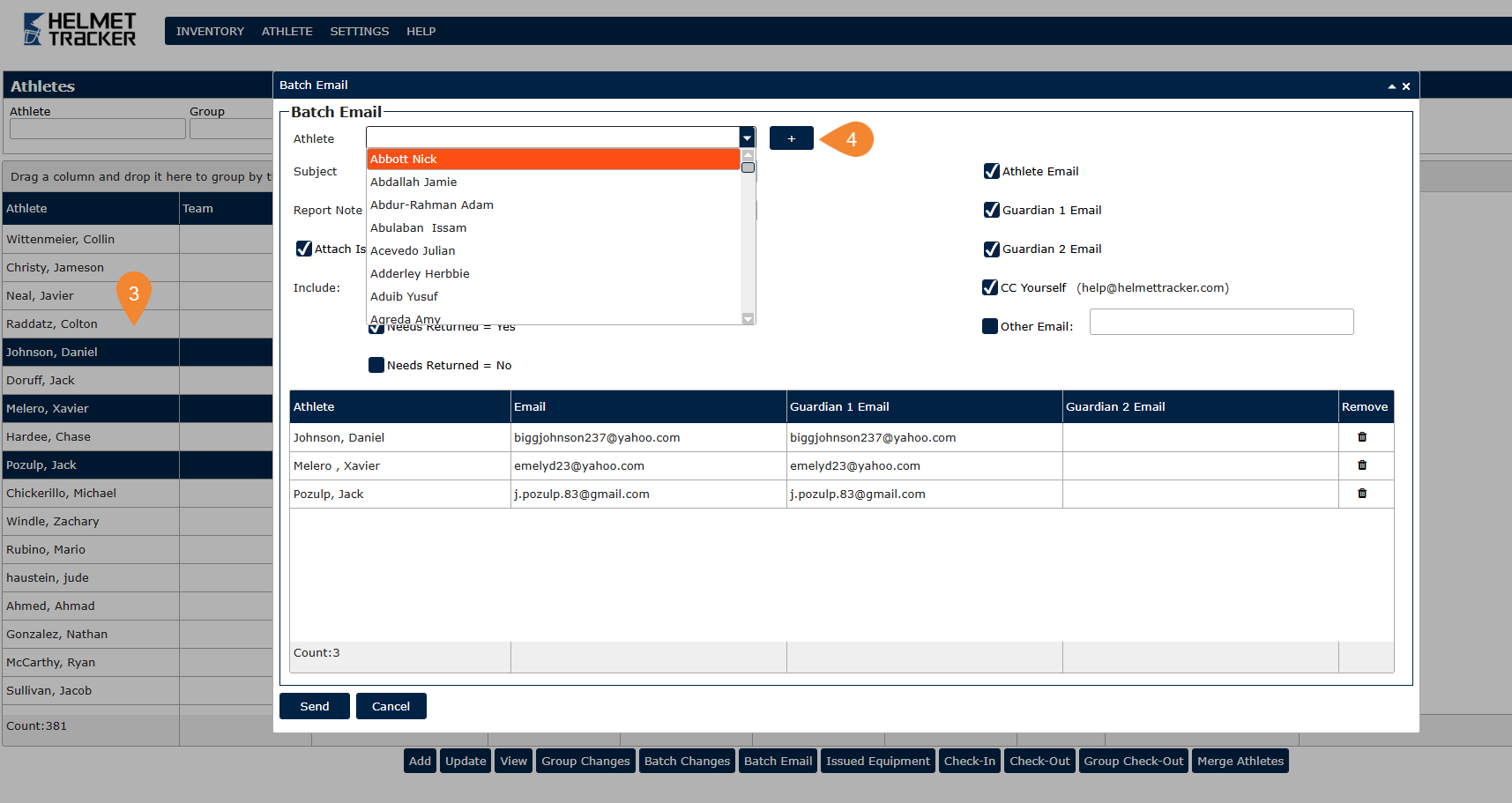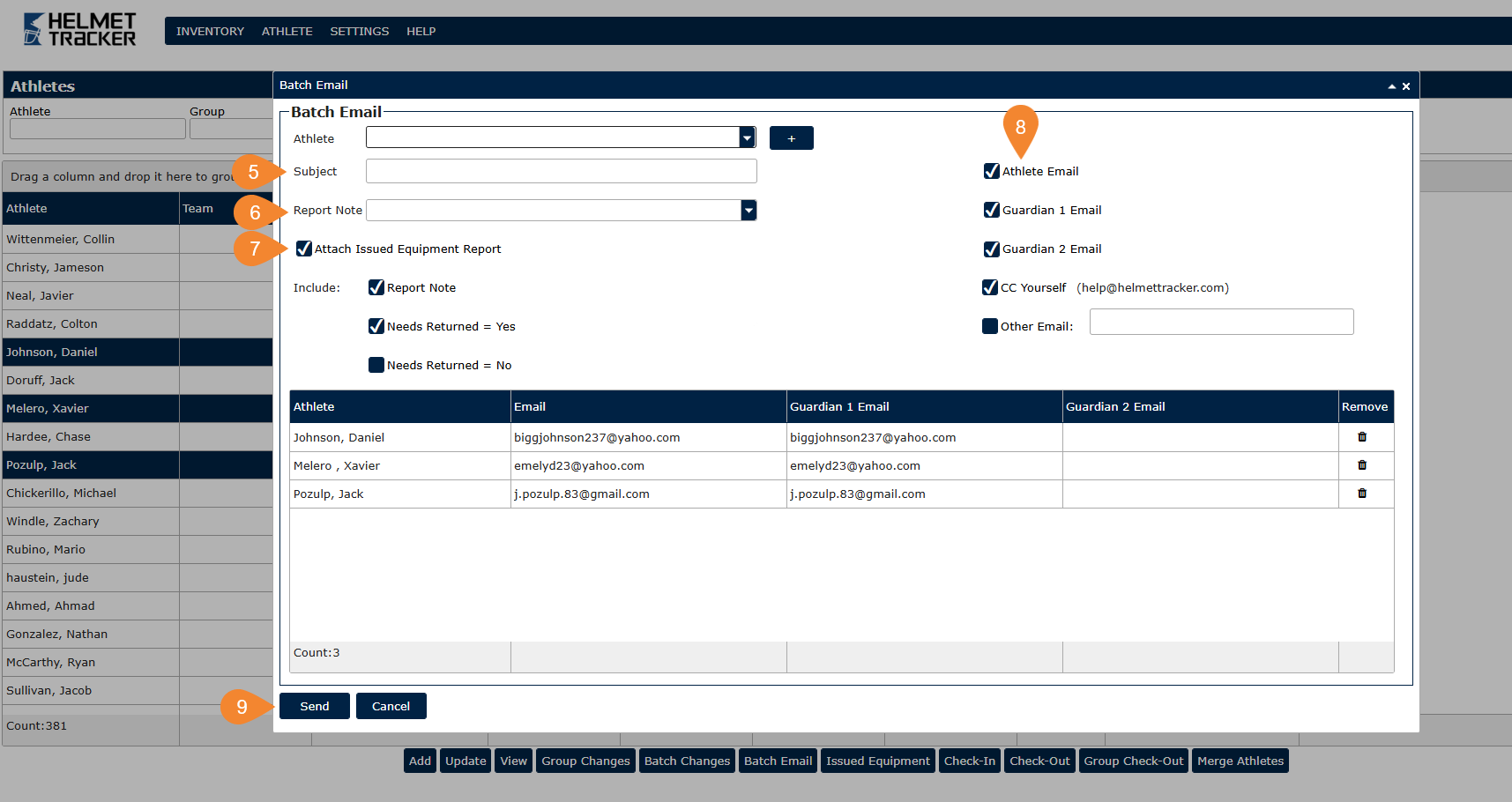 This functionality allows emails to be sent to one or more athletes with or without an Issued Equipment Report.