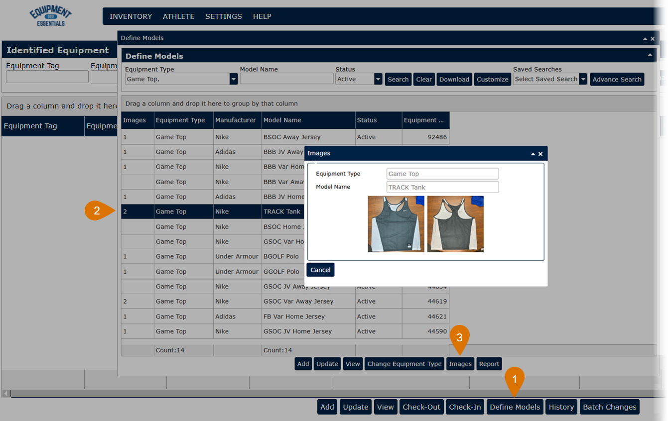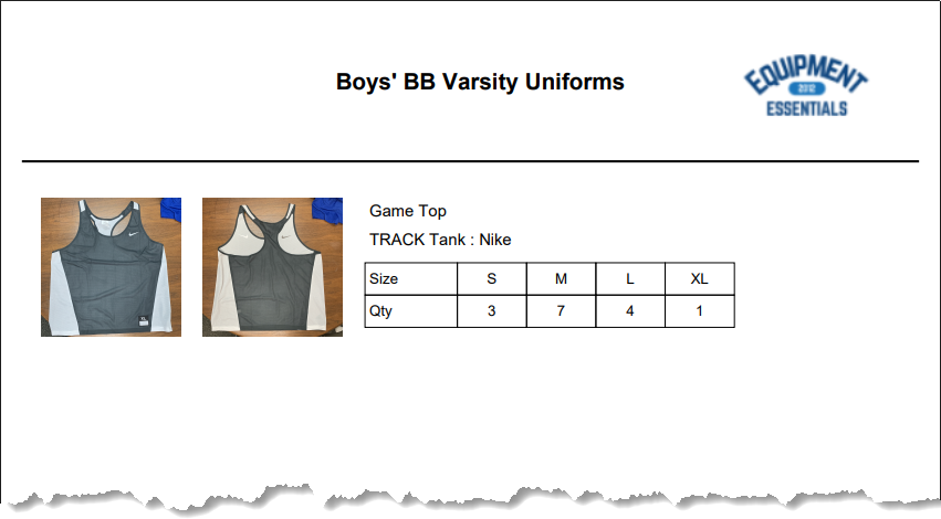 Using the mobile app, images can be added to the system for each Identified Equipment Model. These images are printed on 3 standard reports: (1) Model Images with Size counts, (2) Model Images with Sizes and Uniform Numbers, and (3) Model Images with Sizes, Uniform Numbers, and space for notes.